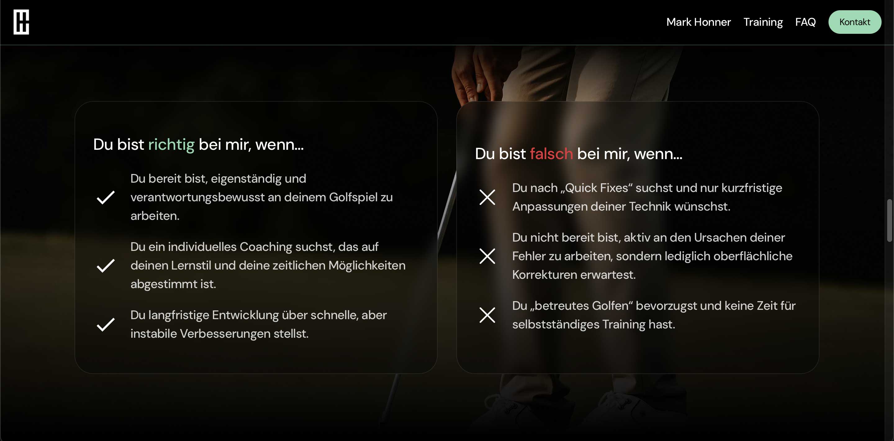 Die Website von Mark Honner präsentiert seine Dienstleistungen als Golfcoach auf professionelle und ansprechende Weise. Sie kombiniert schnelles Laden, responsives Design und eine benutzerfreundliche Oberfläche, um potenzielle Kunden effektiv anzusprechen und ihnen den Weg zu einer erfolgreichen Zusammenarbeit zu ebnen.